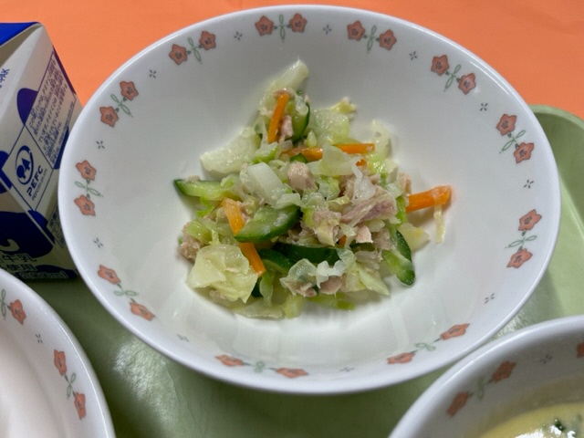 今日の主菜は「さばの味噌煮」です。甘辛いみそだれでご飯が進む味付けですね。みなさんは普段家で魚料理を食べていますか?生臭さや骨を取るのが面倒・・などの理由で近年、魚を食べなくなる人が増えているといいます。体をつくるもととなるたんぱく質は肉や卵などでも摂れますが、魚を食べることで効率よく摂取できる栄養素も多くあります。将来の健康のためにも、ぜひ魚料理に親しんでもらいたいです。