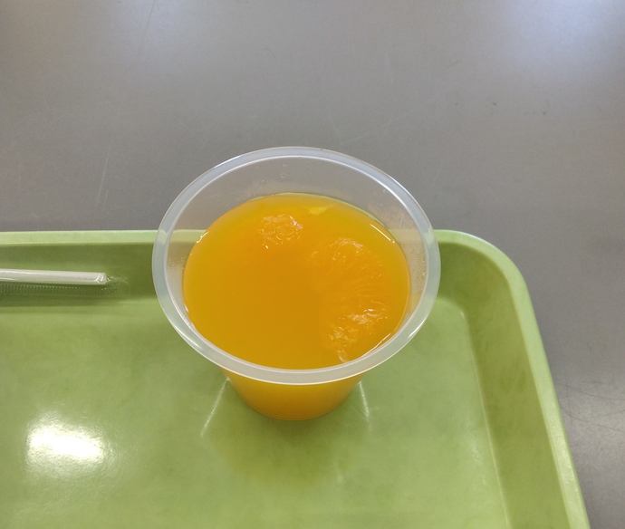 オレンジかんは粉寒天を冷やし固めてつくっています。寒天は紅藻類(こうそうるい)という種類の海藻が原料ですが、海藻をぐつぐつと煮込み冷やし固めたものが「ところてん」。ところてんから水分を取り除いて乾燥させたものが「寒天」です。豚丼は豚肉、玉ねぎ、にんじん、糸こんにゃく、干し椎茸、にらがはいっています。豚丼は日本発祥の料理です。今日もおいしくいただきましょう!