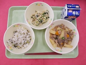 たけのこご飯 けんちん味噌汁 鯖の南部焼き 磯和え 牛乳