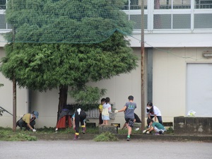 9月23日(土曜日)午前、PTA地区委員さんや保護者と子供たち、野球やサッカーで校庭を使用する団体の子供たちが校庭の草取りをしてくれました。わずか30分の間に校庭や中庭の草がきれいに抜き取られ、大きな袋が何袋にもなりました。天気が心配される中たくさんの皆様に集まっていただきありがとうございました。草取りの終わりにかき氷の差し入れがありました。作業のあとのかき氷は格別に美味しかったです。参加した子供たちも汗をかいた後のかき氷を美味しそうにいただいていました。きよせラボの皆様も応援ありがとうございました。