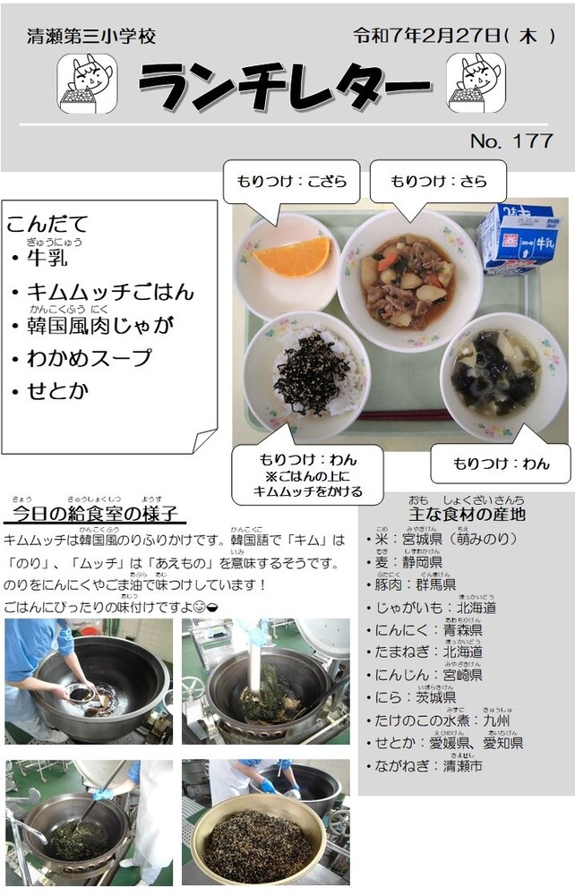三小 今日の給食 令和7年2月 ページ番号2006527 更新日 2025年2月28日 印刷大きな文字で印刷 より良いウェブサイトにするために、ページのご感想をお聞かせください。 このページに問題点はありましたか?(複数回答可) 特にない 内容が分かりにくい ページを探しにくい 情報が少ない 文章量が多い このページの情報は役に立ちましたか? 役に立った 役に立たなかった このページは見つけやすかったですか? 見つけやすかった 見つけにくかった 送信 このページに関するお問い合わせ 清瀬第三小学校 〒204-0023 東京都清瀬市竹丘1-15-4 電話番号:042-493-4313 ファクス番号:042-495-6033
