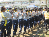 午後の最初の種目は、2年1~4組と1~3年5組による大繩跳びです。2回チャレンジでの合計回数を競います。最初の練習では数回しか続かずに悪戦苦闘をしているクラスが多かったですが、並び順や掛け声の練習、跳び方のレクチャーなど、各学級で試錯誤をしながら、徐々に連続回数を伸ばして行きました。当日も熱戦が繰り広げられて、順位は僅差の結果となりました。この競技に、5組生徒が学年合同で参加しました。