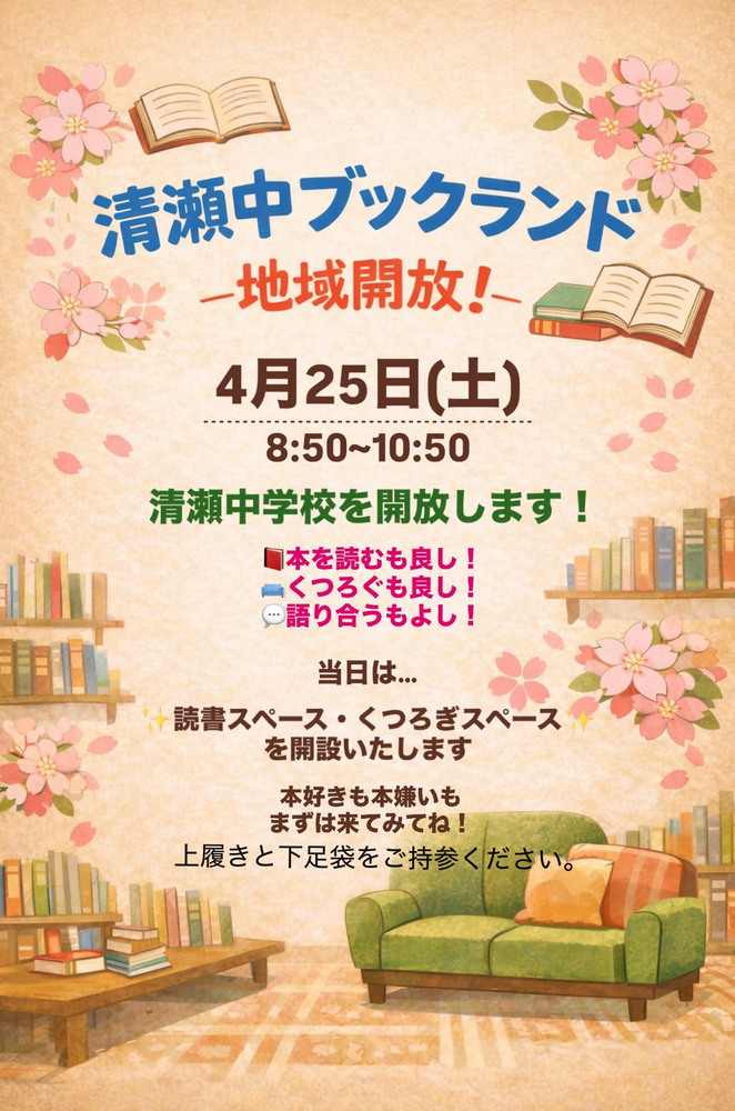 清瀬中学校 コミュニティ・スクール委員会 ページ番号2007144 更新日 2026年4月20日 印刷大きな文字で印刷 関連ファイル 図書館地域開放 4月25日 コミュニティ・スクール委員会 (Jpeg 242.2 KB) より良いウェブサイトにするために、ページのご感想をお聞かせください。 このページに問題点はありましたか?(複数回答可) 特にない 内容が分かりにくい ページを探しにくい 情報が少ない 文章量が多い このページの情報は役に立ちましたか? 役に立った 役に立たなかった このページは見つけやすかったですか? 見つけやすかった 見つけにくかった 送信 このページに関するお問い合わせ 清瀬中学校 〒204-0003 東京都清瀬市中里5-624 電話番号:042-493-6311 ファクス番号:042-495-3941
